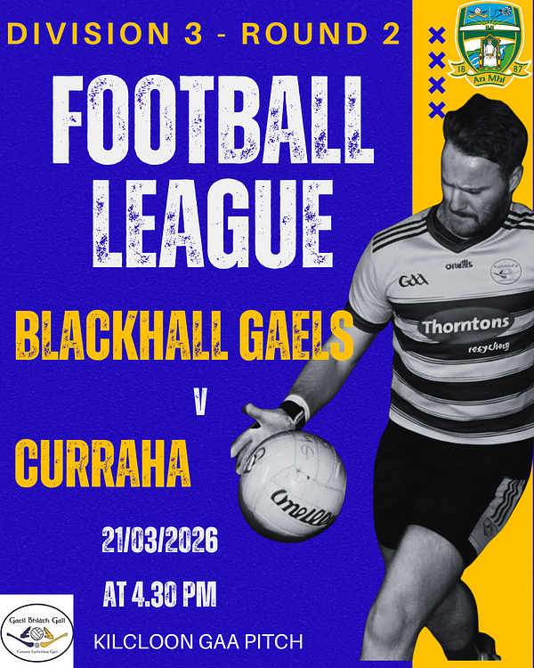 Our Division 3 Men's Footballers continue their league campaign today, Saturday March 21st 2026, as they take on Curraha in Round 2. Throw in is at 4.30pm in Kilcloon and the lads are ready to build on their start and put in a strong performance on home soil.
