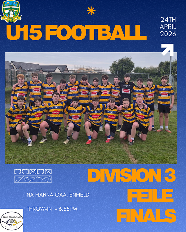 Best of luck to our U15 boys who are in action tonight, Friday, April 24th, 2026, in the Division 3 Féile Football Finals.