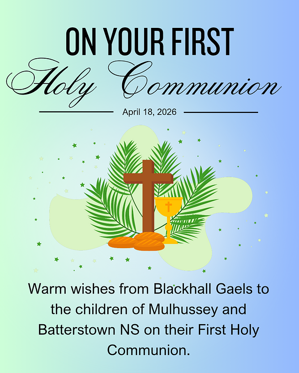 Warm wishes from Blackhall Gaels to the children of Mulhussey and Batterstown NS on their First Holy Communion tomorrow, April 18th 2026.